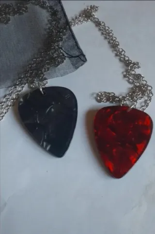 Dos colgantes, cadena más púa de guitarra. Una es roja y la otra negra. Por detrás son negras lisas. Chulisimas