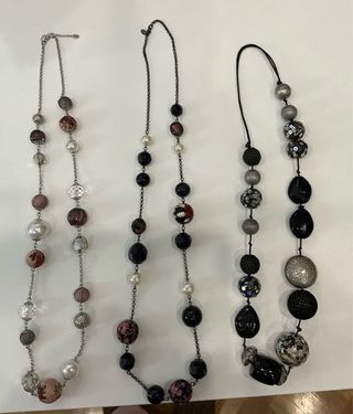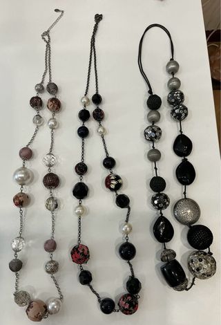Lote de tres collares largos con un diseño inspirado en el estilo chino. Cuentan con una variedad de cuentas y adornos. - Cuentas de diferentes tamaños y texturas. - Cadenas metálicas. - Cierre de mosquetón.