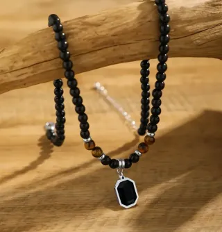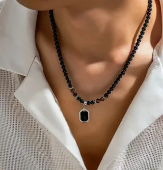 Elegante collar con cuentas y un colgante rectangular. - Cuentas de color negro y marrón. - Colgante central de diseño octogonal. - Se entrega con caja unboxing personalizada de regalo.