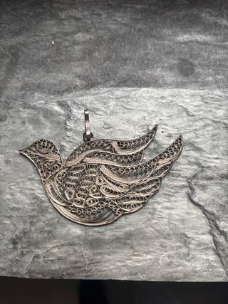 Precioso colgante de plata con diseño de pájaro. - Elaborado con técnica de filigrana. - Pieza de artesanía detallada. - con sello por la parte de atras numerado - Necesita limpieza para sacar todo su brillo de plata