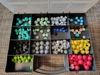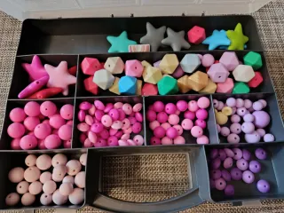 Lote de abalorios de silicona, ideales para la creación de chupeteros, colgantes y manualidades. Incluye las cajas, son 2 cajas dobles , una de ellas está un poco rota el enganche. Las cuentas completamente nuevas, son restos de tienda. No sé venden abalorios, ni letras sueltas. - Material: Silicona. - Formas variadas. - Colores: variados