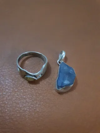 Conjunto de colgante y anillo. - Colgante con piedra azul. - Anillo con piedra amarilla. - Plata 925.