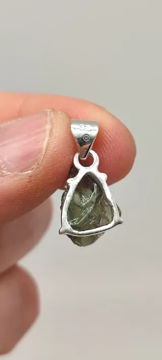 Bonito colgante de plata de ley 925 y Moldavita. Medida 2,1×1,2 cm con el engarce. Se entrega con bolsita para regalo.