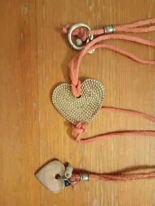 Este colgante o pulsera tiene un diseño encantador con forma de corazón. La cadena es de un suave color rosa y el corazón principal está adornado con pequeñas incrustaciones brillantes. - Colgante con forma de corazón. - Cadena de cordón rosa. - Detalle de pequeñas piedras brillantes en el corazón.