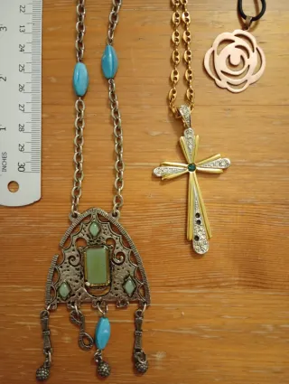 Elegante cadena con un colgante de diseño único, bisuteria de calidad presenta detalles en varios colores. - Cadena de metal dorado. - Colgante con incrustaciones de colores