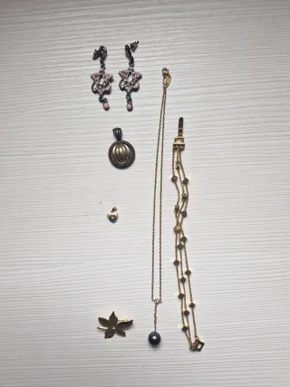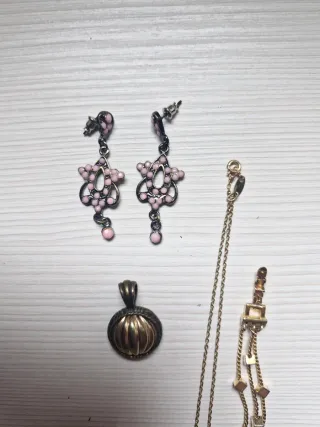 Conjunto de bisutería variado con varios complementos. - Pendientes colgantes con detalles en rosa. - Colgante con forma de calabaza. - Colgante pequeño con forma de corazón y circonita. - Broche con forma de flor. - Collar largo con perla negra. - Pulsera de cadena con eslabones cuadrados.