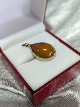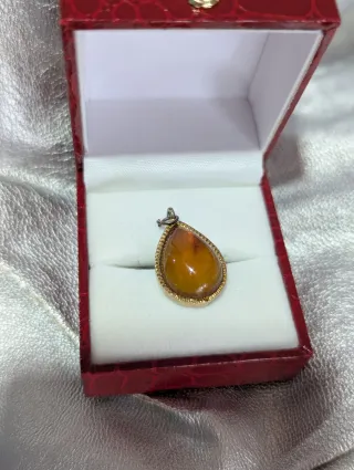 Elegante y antiguo colgante con una piedra de ámbar en forma de gota. La montura es de metal dorado. - Piedra de ámbar natural. - Diseño en forma de lágrima. - Montura con detalles. - Cierre para cadena.