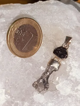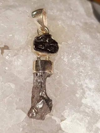 Este colgante combina la energía de un meteorito campo de cielo con la pureza del shungit elite engarzado en plata de ley - Pieza única con un diseño distintivo. - El shungit elite es conocido por sus propiedades. - El meteorito aporta un toque cósmico. Minerales cuarzos geoda drusa colección terapia obelisco espacio universo UFO regalo adorno joyería plata oro amor