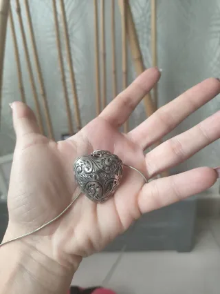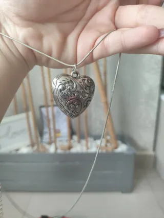Este colgante tiene un diseño de corazón con detalles grabados. - Diseño de filigrana. - Cadena fina. - Cierre de mosquetón.
