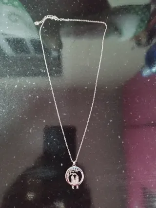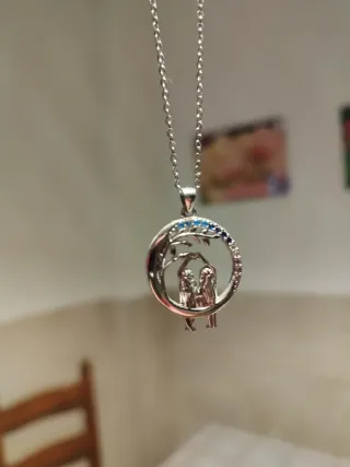 Elegante collar de plata 925 con un colgante circular que representa a una pareja, amigas, hermanas o primas bajo un árbol. Los detalles en azul y plateado le dan un toque especial. Medida: 45x5 - Diseño circular con silueta de pareja. - Detalles en tonos azules y plateados.