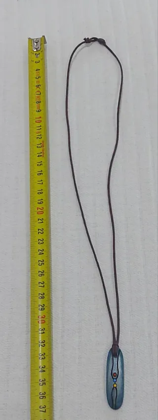Colgante artesanal con un diseño ovalado y detalles pintados. - Elaborado en madera. - Presenta un diseño con líneas finas y pequeños puntos de colores. - Cuelga de un cordón marrón ajustable.