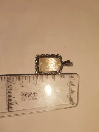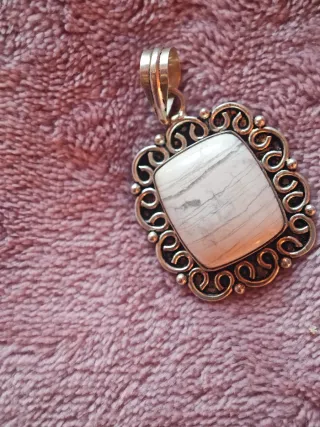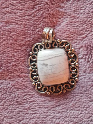 Bonito colgante con detalles plateados y una piedra central de color blanco con vetas grises. - Diseño con filigranas. - Cierre de plata. - Sello '925' visible.