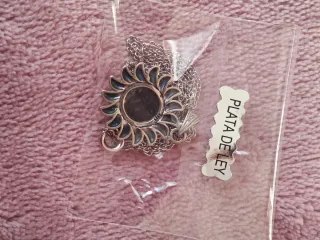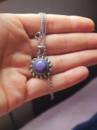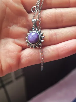 Elegante colgante con diseño de sol y una piedra central morada. - Cadena de plata. - Detalle de rayos alrededor de la piedra.
