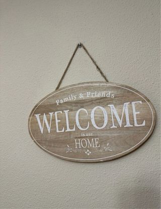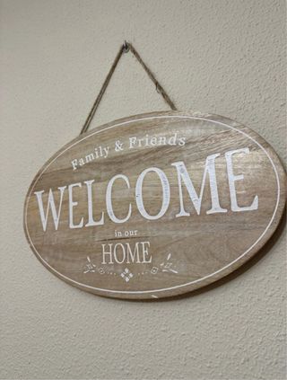 Este colgante de madera aporta un toque acogedor a tu hogar. - Diseño ovalado con la palabra Welcome. - Frase Family & Friends in our HOME grabada. - Acabado en madera natural con detalles blancos.