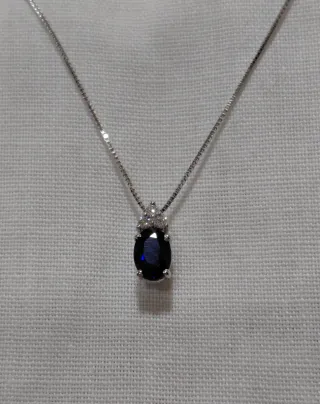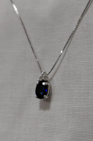 Colgante de cinco zafiros de 0.10tcw y un diamante de 0.03ct de corte redondo, brillante, excelente. Color G/H. Claridad vs1-vs2. Peso total 1.5 gramos(el peso que pone en la tarjeta está mál). En oro blanco 18k. Incluye cadena veneciana regulable de 40-45 cm. Nuevo sin estrenar. Incluye garantia gemológica.