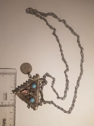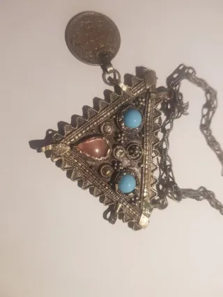 Colgante con cadena de 33cm. - Colgante triangular con adornos. - Incluye piedras de color azul y rosa. - Detalle de moneda antigua.