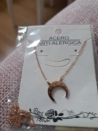 Elegante cadena de acero con un delicado colgante en forma de luna creciente adornada con pequeñas estrellas. - Material: Acero. - Diseño: Luna creciente con estrellas. - Estilo: Moderno y sutil. No pierde el color ni aún mojandose.