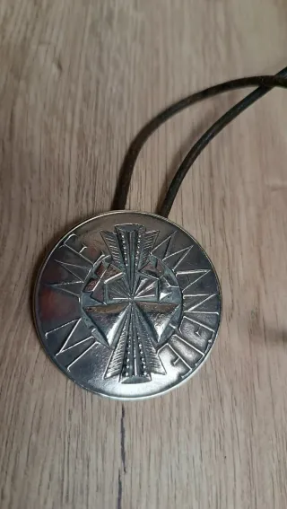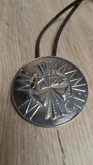 Colgante con diseño de medalla vintage muy antigua, posiblemente Americana. - Diseño circular con detalles grabados. - Cordón de cuero para colgar.