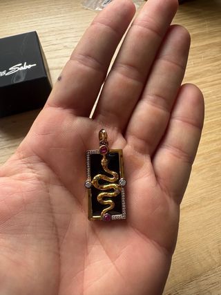 Elegante colgante con diseño de serpiente. - Detalles en oro. - Piedra central de ónix. - Acentos de rubíes y diamantes.