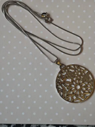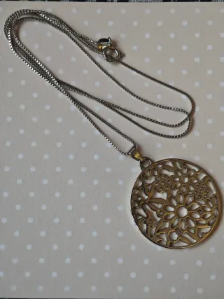 Elegante colgante con un diseño circular y un intrincado patrón floral. Baño de plata. - Acabado en tono dorado y plateado. - Cadena de eslabones tipo caja.