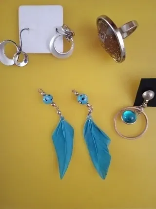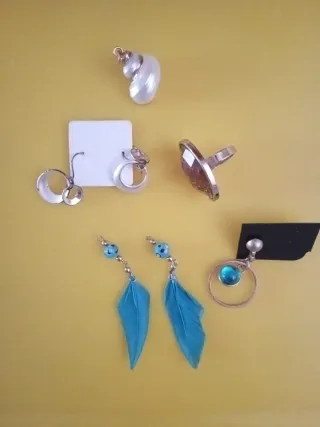 Conjunto de accesorios de joyería que incluye pendientes, un colgante y un anillo. - Un colgante con forma de caracola. - Dos pendientes colgantes con plumas azules. - Un par de pendientes circulares. - Un anillo con una piedra marrón.