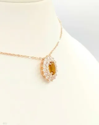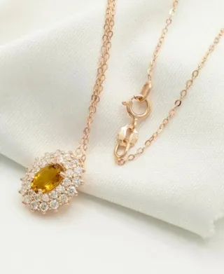 Elegante colgante de oro rosa 14k. - Hermoso topacio amarillo como piedra central de 0.82ct. - Circunferencia de brillantes diamantes naturales de corte redondo brillante excelente de 0.42ct. Peso total 1.66 gramos. El colgante mide 12.15 × 10.30mm. Incluye cadena de oro rosa 14k ajustable de 40-45cm. - Diseño delicado y sofisticado. Se envia en cajita y con certificado de garantía. Es nuevo y sin estrenar.