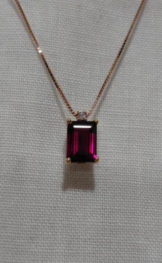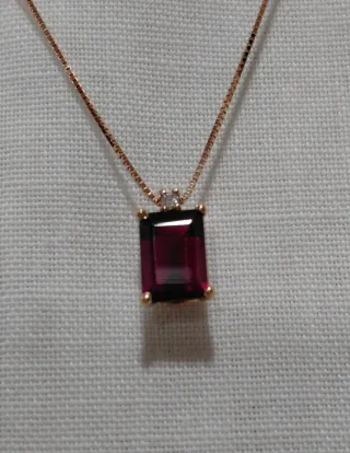 Collar y colgante diamante y granate rodolita en oro rosa 18k. Este colgante está adornado con rodolita de 0.30 ct, de corte esmeralda con una claridad excelente y con un diamante natural de corte brillante excelente de color G/H y claridad VS1/VS2. Peso total 1.5 gramos. Incluye tarjeta que garantiza su autenticidad.