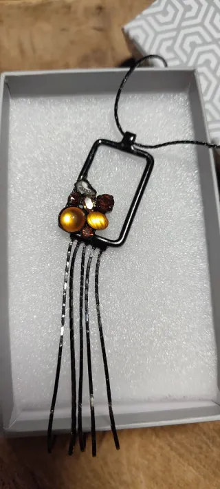 Elegante colgante con un diseño moderno y llamativo. - Colgante de bronce. - Adornado con piedras de tonos dorados y marrones. - Cadena rígida,fina y discreta.