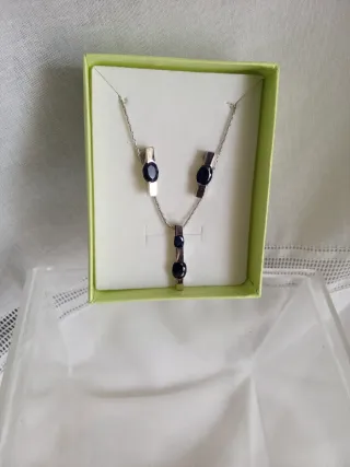Elegante conjunto que incluye pendientes y un colgante. Bisutería - Diseño moderno con detalles en plata. - Piedras de color azul intenso.