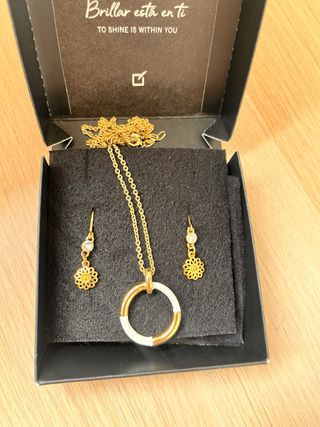 Conjunto de pendientes, anillo, pulsera elástica y colgante con cadena. Nuevo sin estrenar. Bisutería