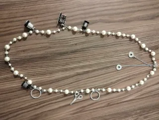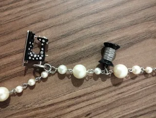 Este colgante está diseñado con un estilo único, ideal para amantes de la costura. - Cadena con perlas de diferentes tamaños. - Adornos en forma de dedal, carrete de hilo, tijeras y aros. - Cierre de mosquetón.