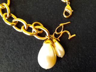 Preciosa pulsera dorada con colgante de perla y logo de la marca.