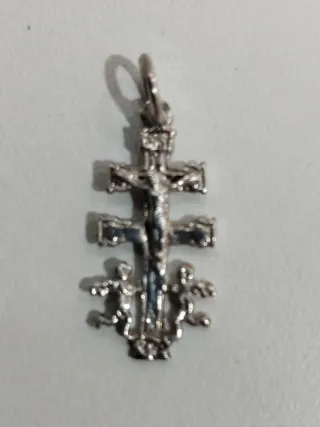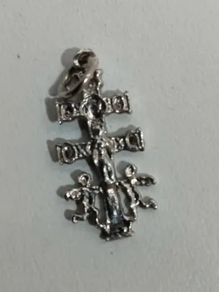 Cruz de Caravaca elaborada en plata. - Diseño detallado con figuras. - Colgante para joyería.