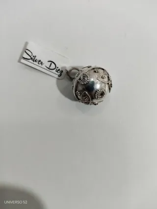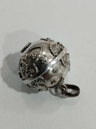 Este llamador de ángeles es una pieza de joyería con un diseño esférico y adornos detallados. - Elaborado en plata. - Diseño esférico con motivos ornamentales. - Incluye un aro para colgar.