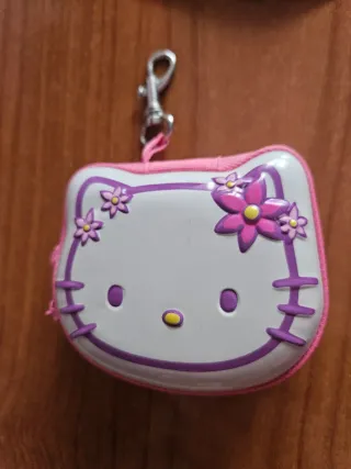 Pequeña cartera metálica con diseño de Hello Kitty. - Cierre de cremallera. - Incluye un colgante con mosquetón. - Adornada con flores. - Color rosa y morado.