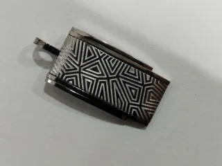 Detalle de colgante con un diseño intrincado. - Piedra central de azabache. - Adornos en acero. - Diseño floral con detalles. - Pequeñas incrustaciones alrededor.