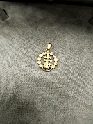 Precioso colgante de oro de 18 quilates con diseño de Cruz de Caravaca. - Detalles en esmalte azul. - Abalorios alrededor del diseño.