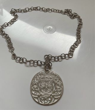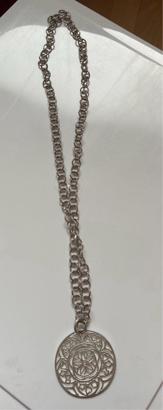 Elegante collar con cadena larga y un llamativo colgante ovalado con diseño calado. - Cadena de eslabones redondos. - Colgante con intrincado patrón floral. - Acabado metálico brillante.