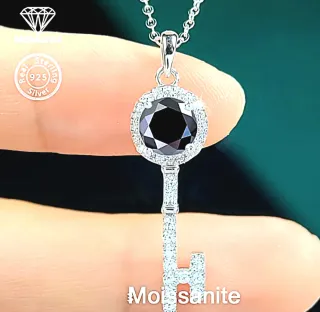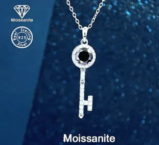Elegante colgante de plata 925S con forma de llave (modelo joyeria Tiffany) adornado con una precioda moissanita negra central de 1kt. La cadena es de plata de 40cm alargable a 45 cm. Se aporta certificado de calidad GRA.
