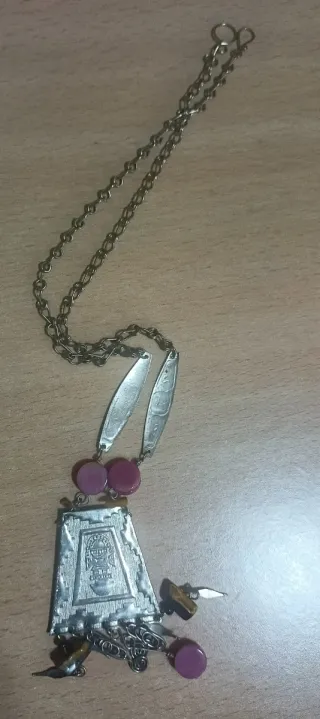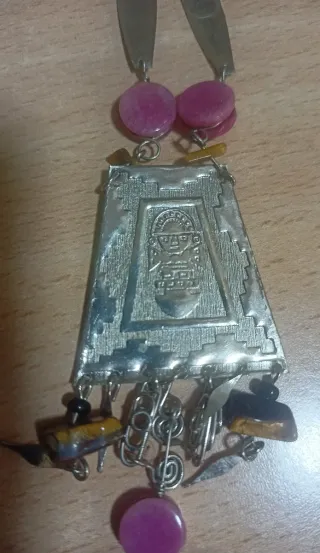 Colgante de estilo vintage con un diseño inspirado en la cultura Inca. La pieza central presenta un grabado detallado. - Colgante con figura central. - Adornado con cuentas de color rosa y detalles metálicos.