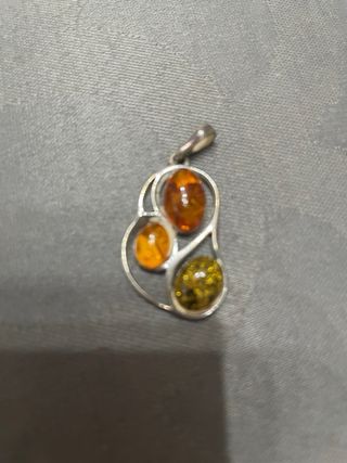 Bonito colgante con un diseño moderno y elegante, adornado con tres piedras semipreciosas de ámbar en diferentes tonos. - Elaborado en plata. - Tres piedras de ámbar. - Diseño único. - Comprado en una feria de Geología.