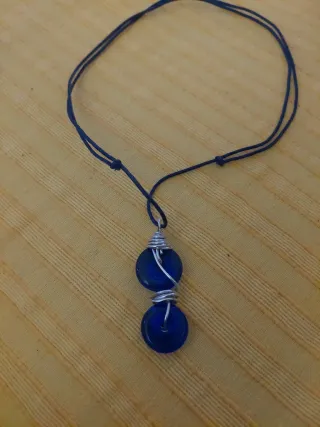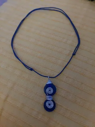 Colgante con dos cuentas de cristal azul envueltas en alambre plateado. - Diseño con espirales. - Cordón ajustable.