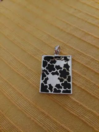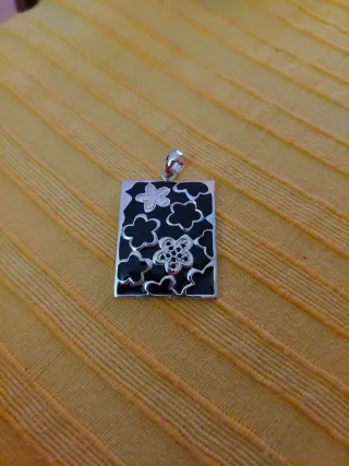Elegante colgante con diseño de flores. - Forma rectangular. - Detalle de flores en relieve. - Acabado plateado y negro.