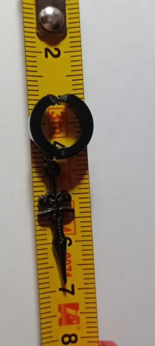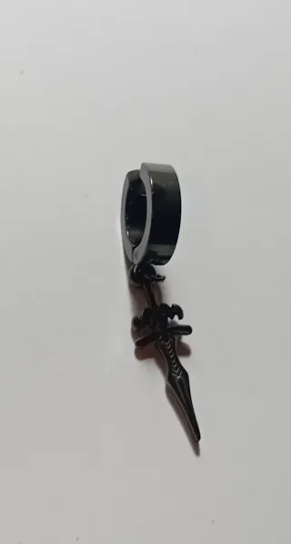 Este pendiente de aro con un diseño llamativo es un accesorio moderno. No hace fata tener agujero Es un sólo pendiente De acero inoxidable negro - Cierre de aro. - Colgante con forma de espada. - Acabado en tono negro.