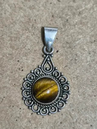 Colgante con piedra natural de Ojo de Tigre, originario de India. Diseño artesanal con detalles plateados. - Piedra: Ojo de Tigre - Origen: India - Material del colgante: Plata Dispongo de más modelos y con la compra de 2 o más, regalo los pendientes artesanos colgantes.