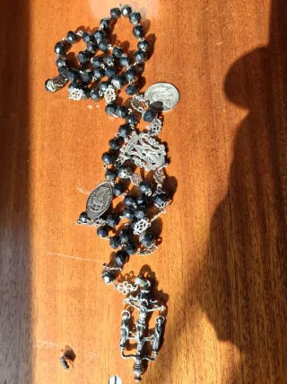 Elegante rosario con cuentas de azabache y detalles en filigrana de plata. - Diseño intrincado en la cruz y el colgante. - Cuentas facetadas de azabache. - Elaboración artesanal en filigranaplata tiene más de 100 años Admito ofertas no ridiculas Tengo más en mi perfil