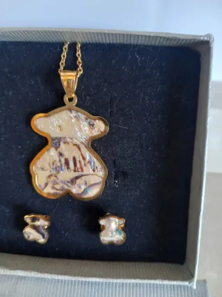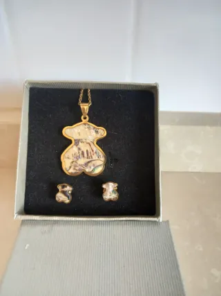 Conjunto de joyería con colgante y pendientes a juego, ambos con forma de oso. - Diseño con incrustaciones nacaradas. - Acabado dorado.