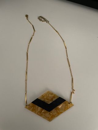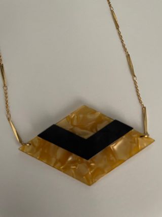 Elegante colgante con un diseño geométrico llamativo. - Colgante con forma de rombo. - Diseño en capas con detalles en negro. - Cadena dorada con eslabones finos.