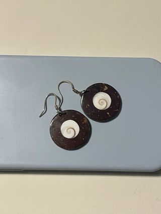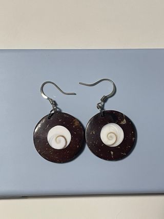 Pendientes colgantes con un diseño único. - Base de madera oscura. - Detalle central en forma de espiral de concha blanca.
