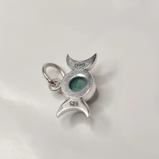 Colgante de plata 925 con una piedra de malaquita en el centro. El diseño presenta tres lunas crecientes rodeando la gema. 1'9g 2cm x 2cm - Material: Plata de ley 925. - Gema: Malaquita. - Diseño: Triple luna.